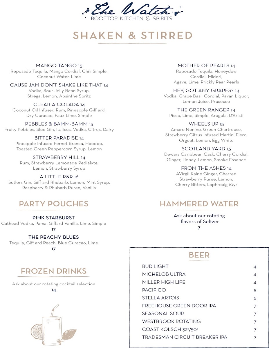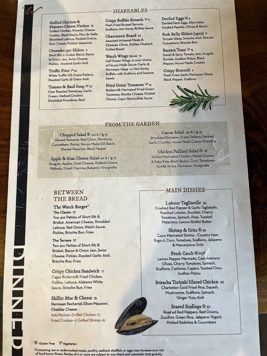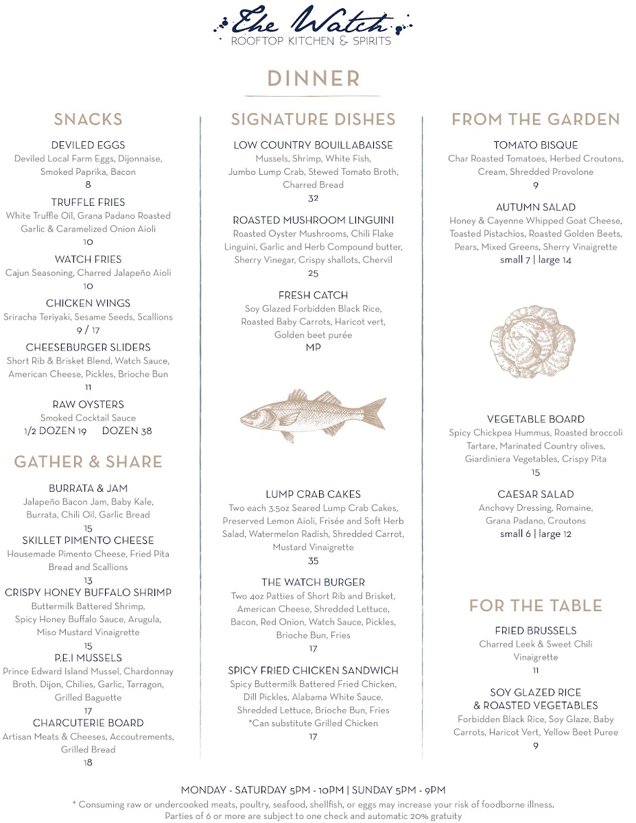 Welcome to The Watch Rooftop Kitchen and Spirits, a hidden gem in Charleston, SC, where Southern charm meets contemporary cuisine. Perched atop the Restoration Hotel, this rooftop eatery offers stunning views of the historic city, making it an ideal spot for leisurely meals and sunset cocktails. The menu showcases a delightful mix of local favorites and innovative dishes. You can't go wrong with the truffle fries and deviled eggs, which receive rave reviews for their rich flavors. For something heartier, savor the braised short rib cavatelli or the coastal flair of the low country bouillabaisse. Vegetarians will appreciate the vibrant salads crafted from seasonal produce. While guests praise the inviting atmosphere and attentive service, a few have noted consistency issues with certain beverages. Overall, The Watch promises a relaxing experience filled with delicious Southern fare amidst Charleston’s enchanting skyline.